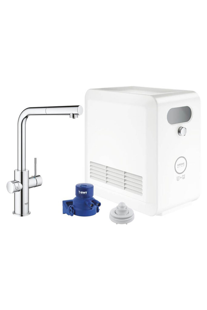 - Convenience and functionality. The Grohe Blue Pull-Out Faucet offers both convenience and functionality. A favorite feature is the pull-down spray head’s ability to deliver chilled and sparkling water on demand. This single handle kitchen faucet is perfect for filling large pots and cleaning dishes, while the push-button technology provides instant access to refreshing sparkling water. It’s the perfect if you love to entertain or simply enjoy a touch of luxury in daily life.