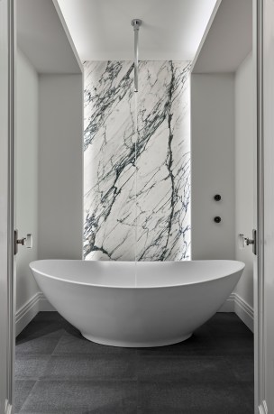 Simplicity – Minimal & contemporary accents are a sure way to make the bathroom feel like a getaway. To create a space that feels at once organic and modern, Fantini Design Awards winner Eric Petschek used Fantini Mint fittings against a natural marble vanity for a subtle contrast against the stone’s gentle, wavy patterns.