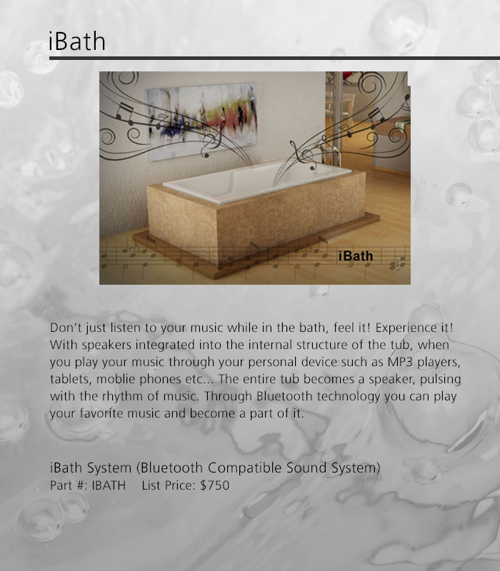 Now they’ve done it. Americh is offering YOU the chance to customize your tub. Your tub, your way. Choose the tub you like and and add features such as Bluetooth iBath system and Vibro Sonic Massage. Bonus; the tub doesn’t need to be filled with water in order to enjoy these features! Climb in the empty tub to enjoy a massage and play your favorite music throughout your bathroom using your tub as the speakers.