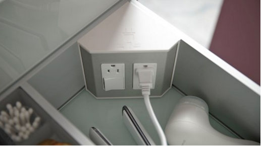 Convenient 110-volt in-drawer electrical outlet supplies power to items such as electric razors, hair dryers and curling irons. This outlet can be paired with an optional hair dryer organizer for the full drawer option.