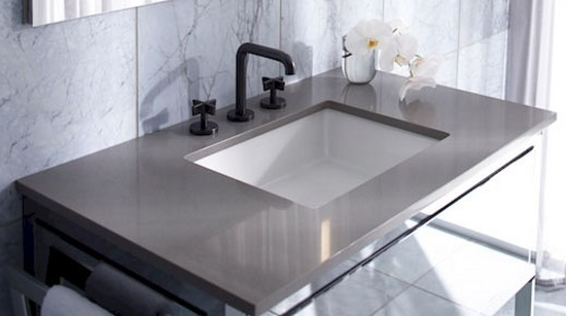 Stone vanity tops are available in Lava Black, Stone Gray or Quartz White and include a separate white rectangular sink. White glass vanity tops with integrated glass sinks can help you build a look you’ll love.