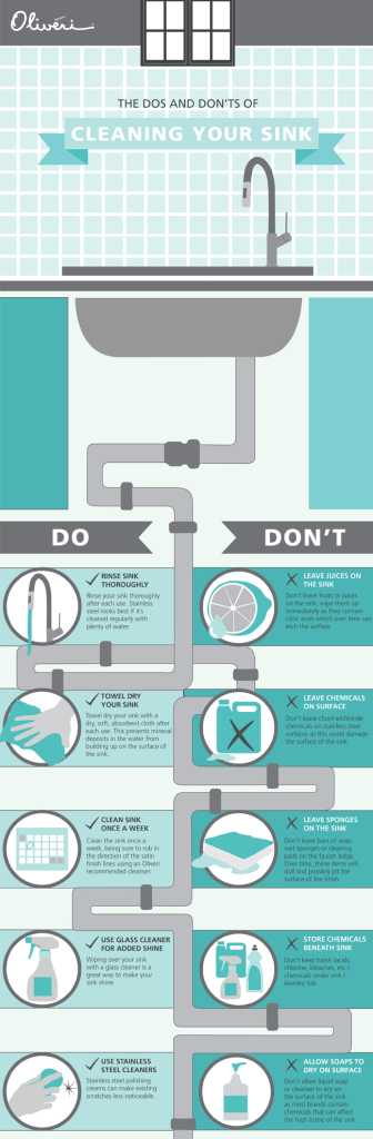 Rinse your sink thoroughly after each use. Stainless steel looks best if it’s cleaned regularly with plenty of water.