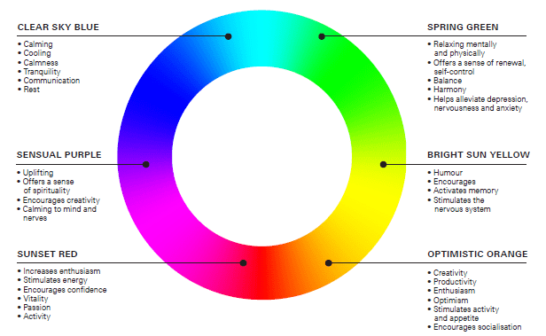 Fun Fact: Every color has a different wavelength and therefore its own energy, which has a varying effect on the mind and body. A main objective when developing GROHE F-Digital Deluxe was to allow you to change the lighting to suit your mood, and to enjoy your own personal chromotherapy experience. Take a look at the color wheel to learn how colors affect your mood.