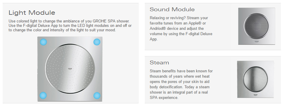 The GROHE SPA® F-digital Deluxe App turns your iPhone® or Android®device into a convenient spa management system. The App lets you select different combinations of music, lighting and steam – creating a unique home spa experience every day.