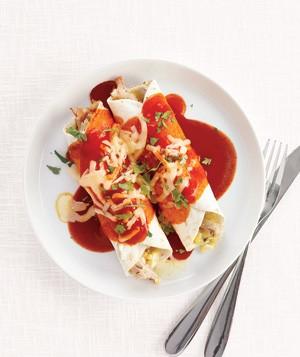 Satisfying, lean, and a real crowd-pleaser, these enchiladas come together in a mere 25 minutes. Here’s how: You’ll start with shredded roasted turkey or chicken (from a leftover or rotisserie bird) and mix it with corn, cheese, salt and pepper. Roll the filling into flour tortillas, transfer the enchiladas to a baking dish, and top the whole thing with store-bought enchilada sauce. After baking the dish for 20 minutes or less, garnish with chopped fresh cilantro, and you’re ready to eat. Chips and salsa or rice and beans—and maybe even a margarita—optional. Don’t expect leftovers; our recipe serves four (two enchiladas per person).