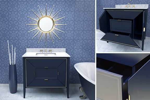 The Amora, brings a sophisticated and fresh look to the bathroom. The avant-garde vanity features an unconventional design and multiple storage opportunities, making a statement in any setting. Completing the overall look, the bathroom furniture piece is offered with an optional Sun mirror. The eye-catching sunburst aesthetic, inspired by classic mid-century modern mirrors and clocks, complements the vanity and brings out the metal detailing.