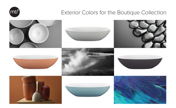 mostly rock minerals combined with high-performance binding agents, that enables us to bring inspired designs to life. Our highly-skilled artisans hand-finish every piece to bring you a fi nished product that is high in aesthetics, river-rock smooth and incredibly durable. Now six exterior colors are available for a select number of Boutique Collection tubs, vessel sinks and semi-recessed sinks. One more way for you to add that special dash of color!