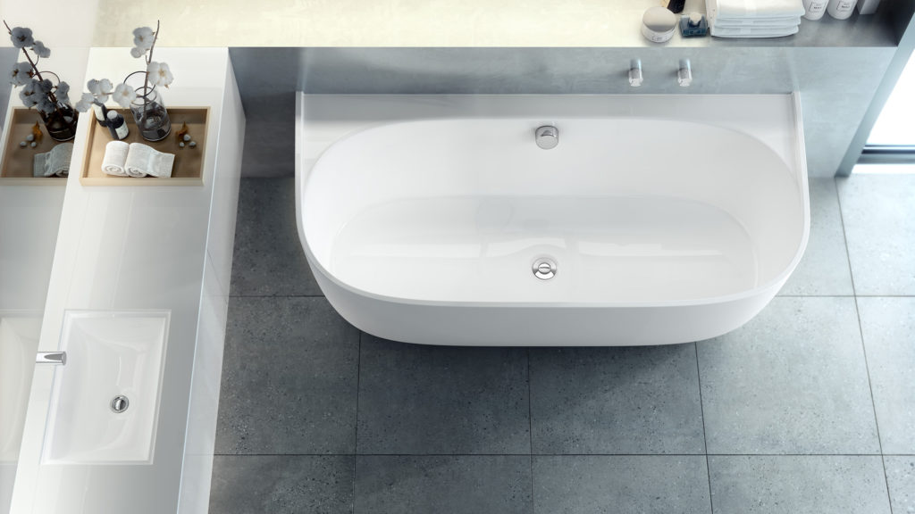 The contemporary back-to-wall bathtub is endowed with the curvaceous lines of a freestanding bath. A full width faucet deck hides all waste pipework and a moulded upstand allows tiles to be easily installed.