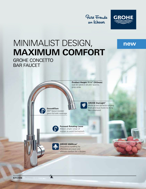 The holidays are upon us! Update your bar with a Concetto faucet from Grohe. Concetto combines stylish minimalist design with superior ergonomics. Consisting of a series of cylinders, an arched spout rises elegantly from the sink. Its purist beauty is highlighted by the high-gloss GROHE StarLight® chrome finish, which repels dirt and prevents tarnishing. GROHE SilkMove® technology enables fingertip control of water flow and temperature. The new bar sink faucet with fixed spout coordinates perfectly with the Concetto range to offer a complete design solution.