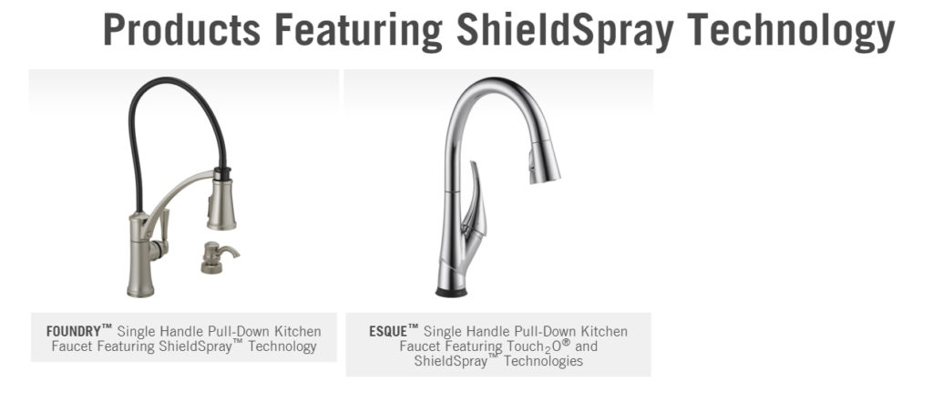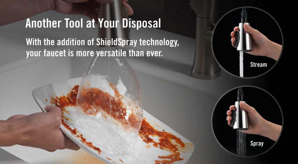 Delta® ShieldSpray Technology cleans with laser-like precision while containing mess and splatter. A concentrated jet powers away stubborn remnants of food while an innovative shield of water surrounds the jet and mess to keep the splashing contained, so you can spend less time soaking, scrubbing and shirt swapping.