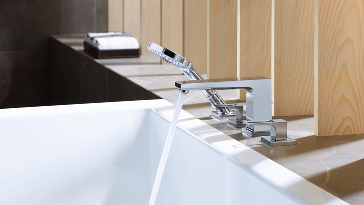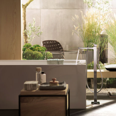 Give your bathtub that special touch with the free-standing faucet in an elegant design (with manual shower), which is also available as a bathtub filler. At the bathtub rim, the Metropol range is available in versions with two, three or four holes. The single-hole concealed faucet has a timeless, square design. All models are available in two handle versions. Two surface-mounted bathtub fillers impress thanks to their prominent, clear shelf surfaces.