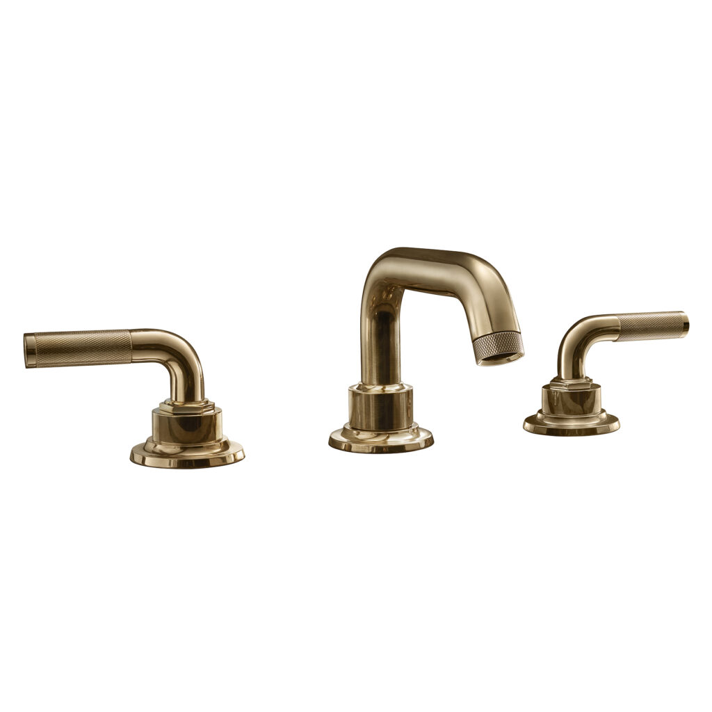 At the heart of the Descanso Series is a cylindrical-shaped widespread lavatory faucet with fluid lines and soft curves. The striking low-profile design is featured in Burnished Brass, a new living finish that is lightly abraded to create a worn, natural aged look that will patina over time. This beautifully imperfect vintage finish sets the stylish tone for the entire series, which includes a lever or cross handle option and a choice of low-spout or swanlike arched spout. And for a variation, there’s a joystick option, which is ideal for smaller baths and powder rooms.