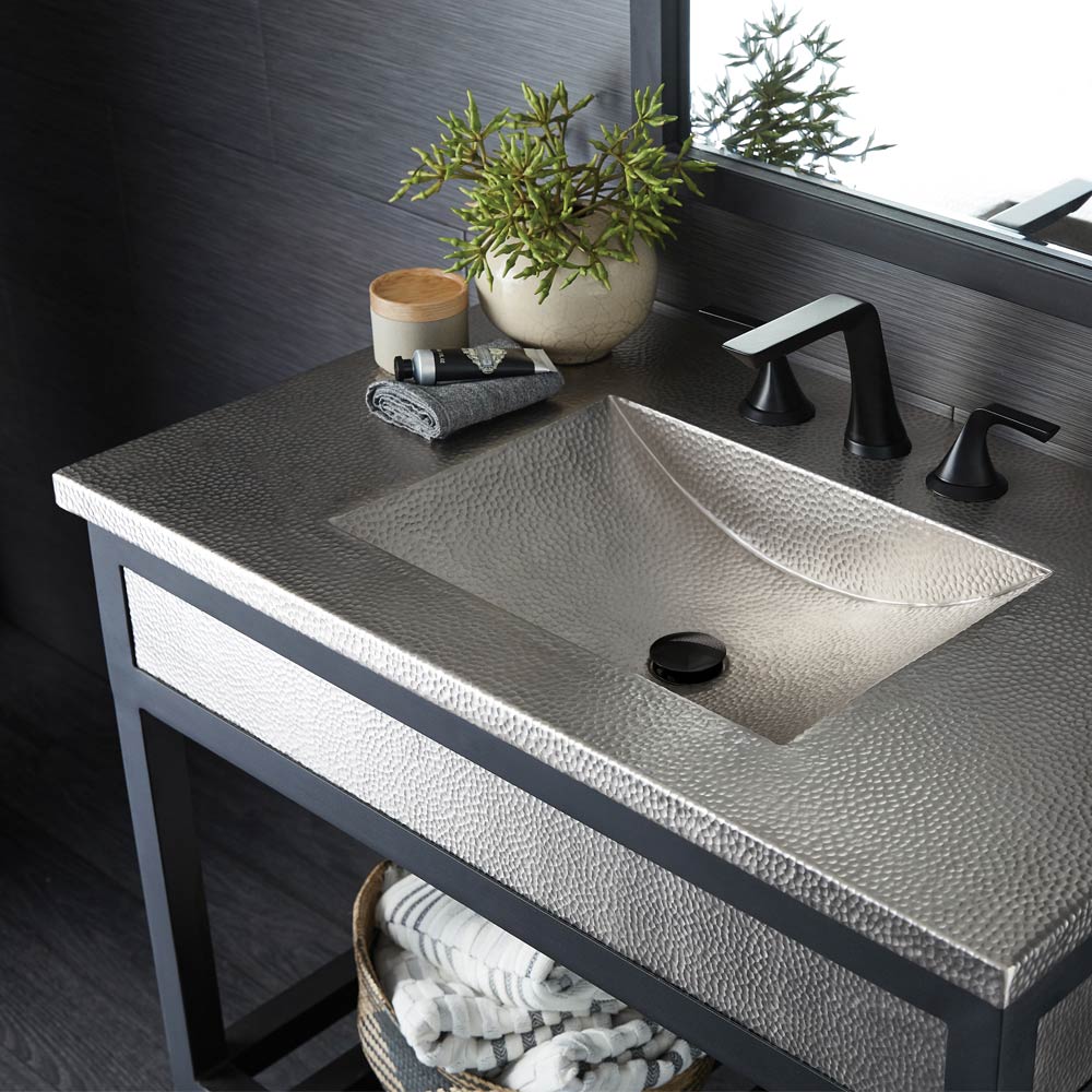 Cozumel Vanity Top is an impressive display of artisan crafted mastery; forged from high-quality recycled copper, hand hammered for strength, visual interest and an appealing texture. Wonderfully functional, Cozumel’s integrated sink and clean lines make for simple maintenance. Gorgeous, durable, and unexpected, Cozumel pairs beautifully with standard sized vanity bases.