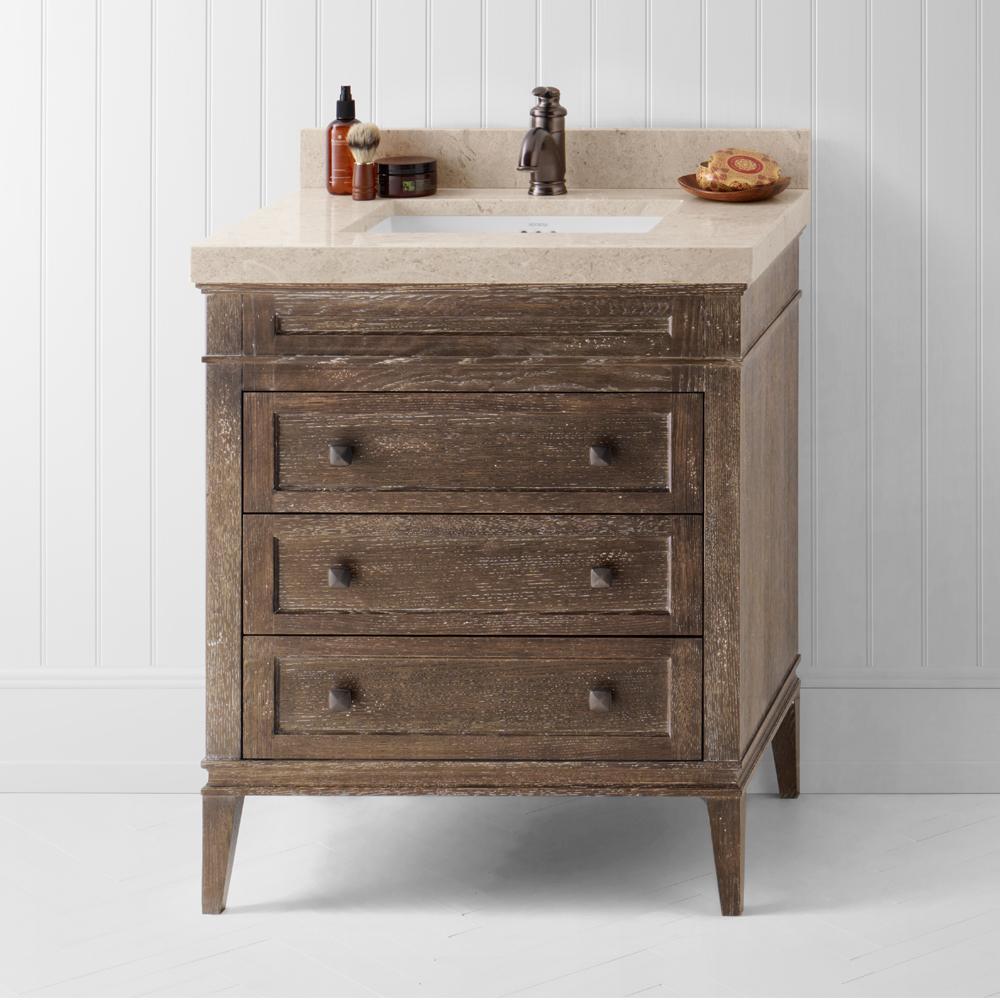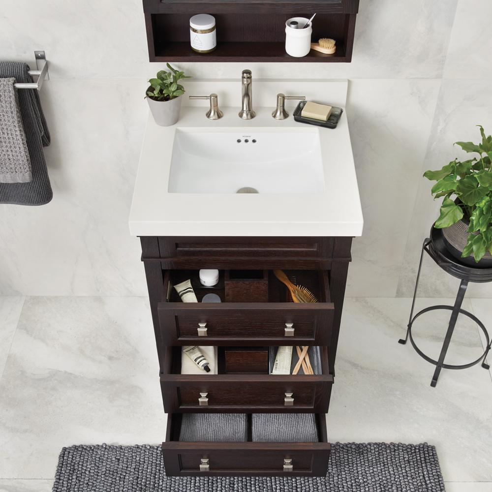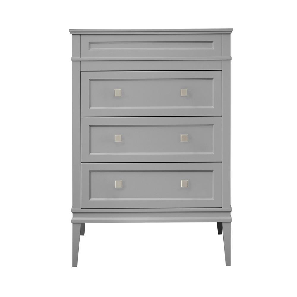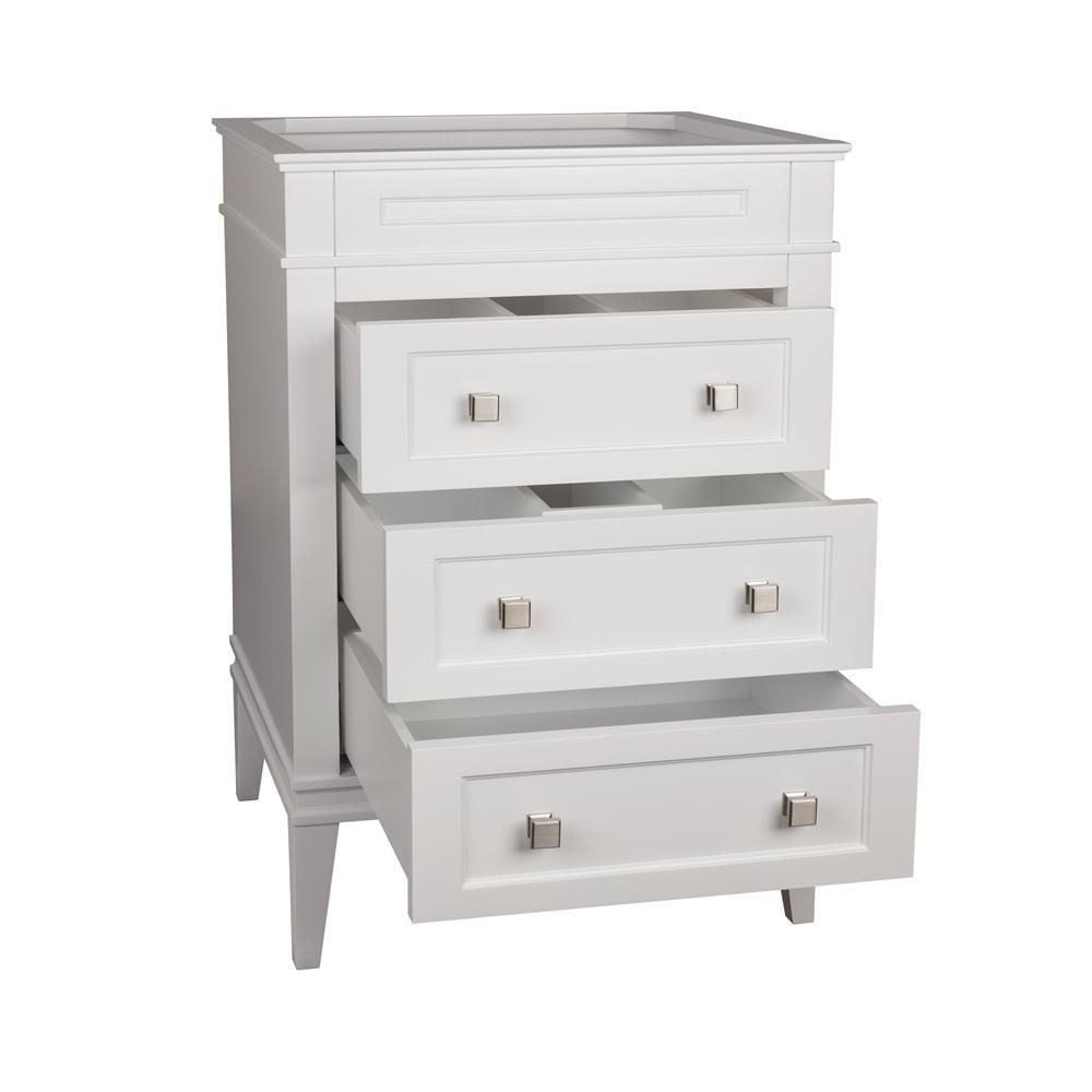 Elegant styling merges with modern taste for a look that reimagines classical elements with contemporary convenience. The transitional Laurel collection features tapered pyramid legs, recessed drawer faces, and raised border detailing with square metal hardware that complements the robust rectangular frame of the Laurel, projecting an air of graceful confidence that seamlessly transforms your transitional bathroom into an undeniably enthralling space.