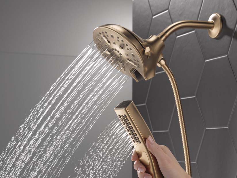 The new Delta In2ition 5-Setting Two-in-One H2Okinetic Shower comes with a detachable hand shower which can be used separately from or simultaneously with the shower head to get water where you need it most.