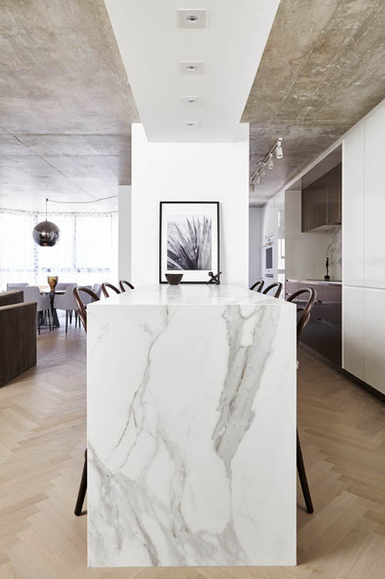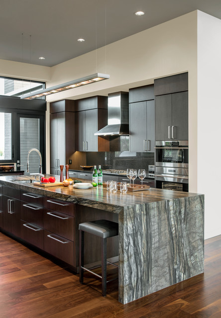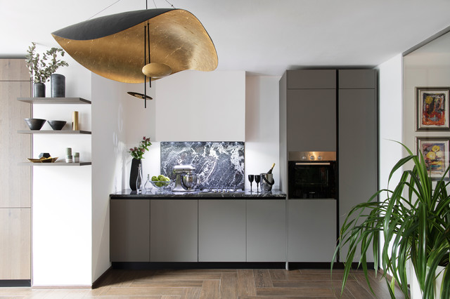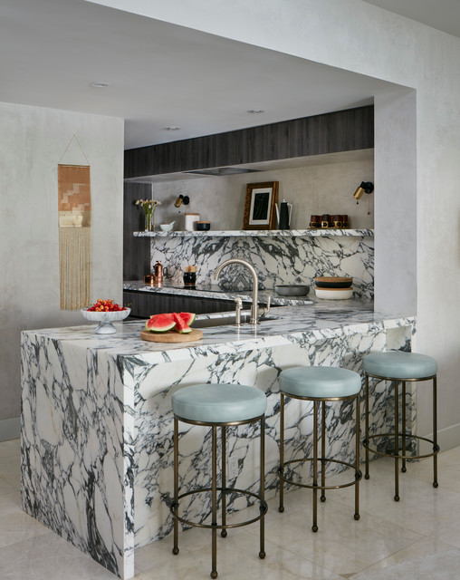 Инна Каблукова This isn’t to say you can’t use a bold stone in a compact kitchen, just that it will feel even more dramatic in scale, meaning you probably will want to keep the other finishes very sedate. Notice how many of these spaces use the same dramatic stone for the counter and the backsplash, making for a truly singular statement.