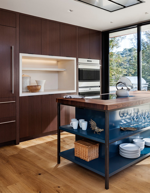 Diament Builders When mixing wood counters with other wood finishes, it’s often best to stick to either warm or cool tones across the board. Red-brown woods are more traditional, while ashy gray tones have been a popular modern trend in recent years. Whichever tones you prefer, they will be less likely to clash if you stick to one family or the other.