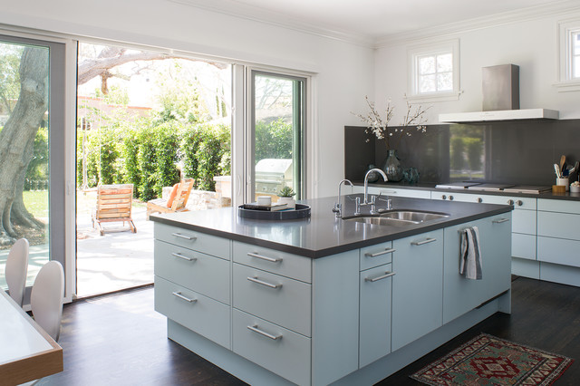 Because white can sometimes absorb and dampen nearby colors, a rich, dark countertop can actually be the better choice to bring out subtle colors in painted cabinets, such as the powder blue door units in this kitchen.