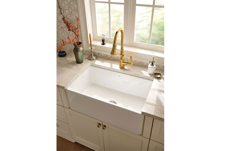 Moen’s new Fireclay sinks are composed of 100% eco-friendly and lead-free fireclay, which creates a chip-, heat- and stain-resistant surface that stands up to abrasive cleaners. A deep bowl accommodates many dishes and even large pots and pans and baking sheets, while the thick and durable material aids in minimizing sound during use.