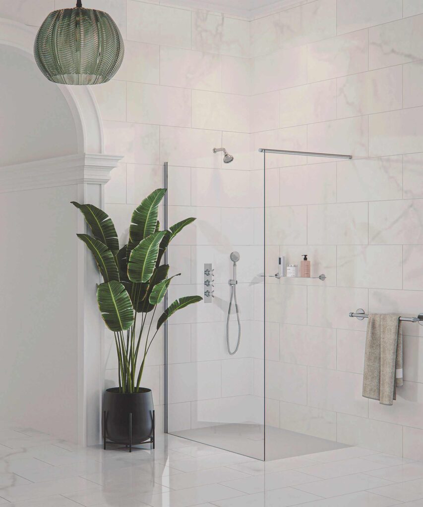 ‘Soggy towels, toilet rolls and flooded floors can be avoided, without losing that all-important openness in look and feel,’ says Nicholas. ‘Panels that integrate into the shower tray with no silicone sealant required are great for a barely-there, frameless look.