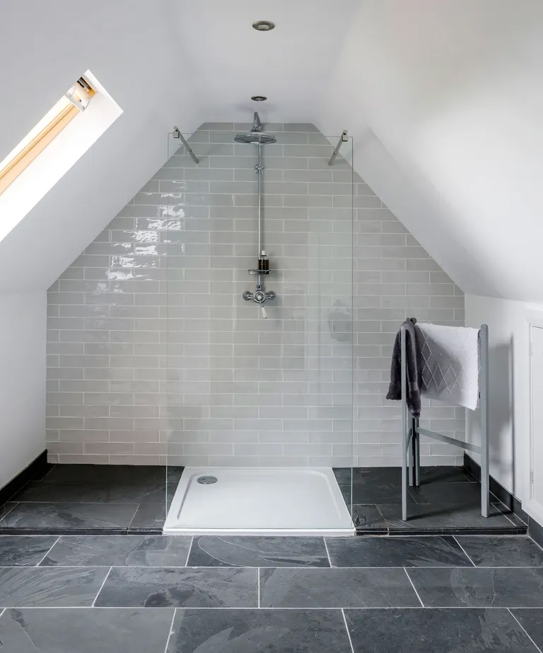 When planning a walk-in shower layout in a loft or attic room, make sure you position the shower where the room is at full height. It’s surprising how little space is needed – and what can be achieved by building a walk-in shower under the eaves.