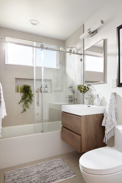 “Dispense with the shower shelf and opt for a niche instead,” Teune says. “It provides a neat, practical spot to store shampoos and soap, and it won’t encroach on your standing space in the shower. Plus, a niche creates a far more sophisticated and streamlined look.”
