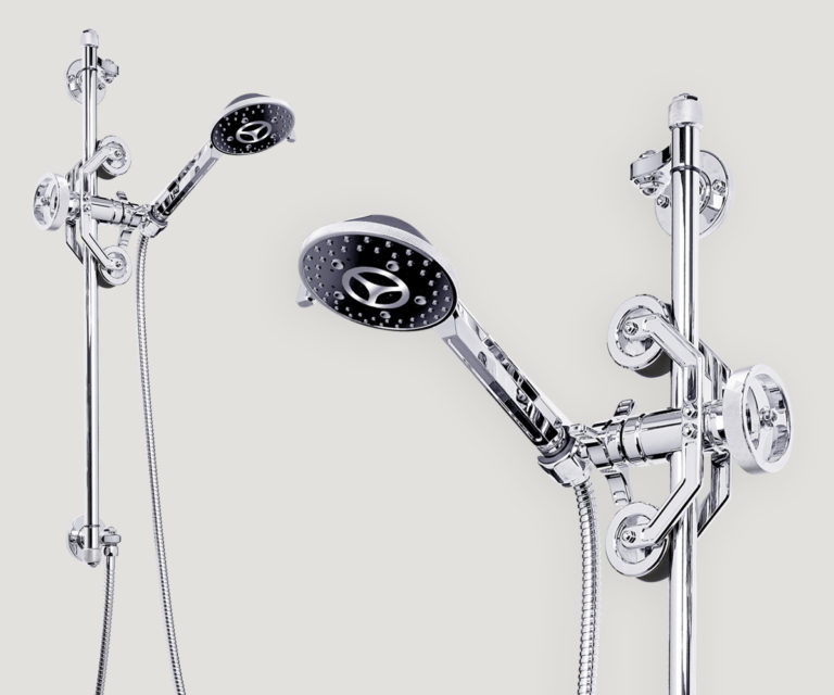 The 27” wheeled slide bar is optimal for customizing the height and angle of the handheld shower, using a three-spoked tension knob that locks the slider in place to adjust height preference. The Hand Shower features three spray patterns for individual comfort.
