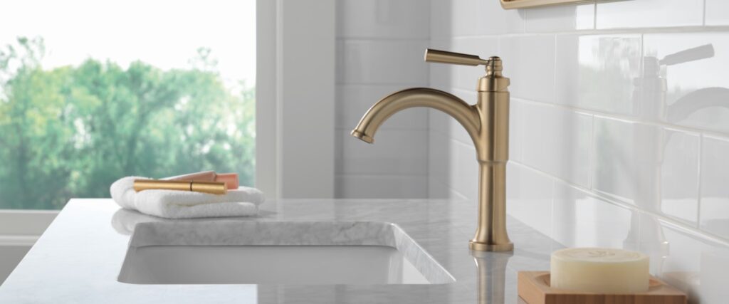 Inspired by the clean, simple lines of modern farmhouse style and the raw functionality of everyday hardware, the Saylor™ Bath Collection is an intriguing blend of both traditional and contemporary design elements. It also features strong, geometric spouts that gently flare at the base and hints of industrial style in the handles.