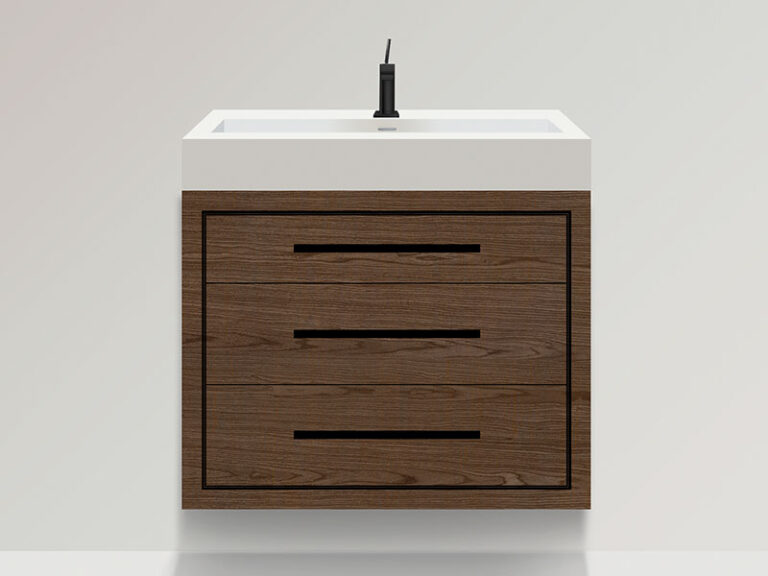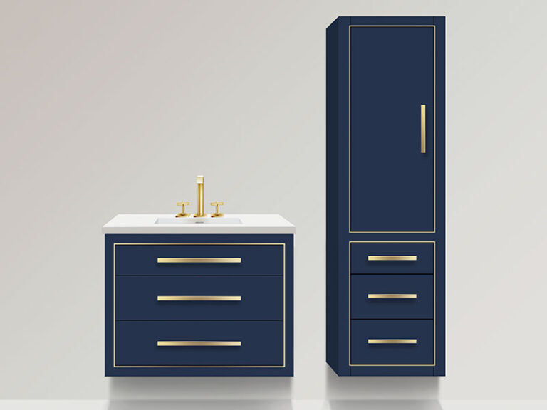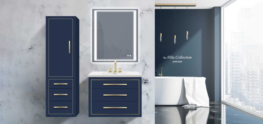 With lustrous metal inset detailing and premium color finishes, the Villa Collection embodies luxurious elegance, while keeping open space to a maximum with its sleek floating wall mount design. It’s the perfect marriage of contrasting texture and tone, both beautiful and functional with lots of personality. Design your own custom look by choosing minimalistic White, or pick from three new color finishes including Brandy woodgrain, ultra-modern Studio Grey and Sapphire. Pair it with your choice of X-Stone™ Solid Surface, Quartzstone, glass or ceramic countertop/basin options. Couple it all with the added advantage of Madeli’s premiere storage options, soft-closing, European hardware, and other luxury features, and you’ll create the ultimate statement in your bathroom.