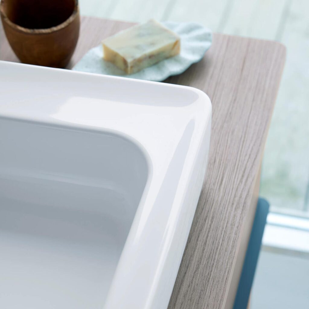 For the washbasins, the shape of the inner basin is reminiscent of the silhouette of dunes formed by the wind. Gentle contours and flowing transitions create discreet spaciousness and are easy to clean at the same time. The well-balanced ratio of basin size, faucet deck shape and storage area make them perfect everyday companions.