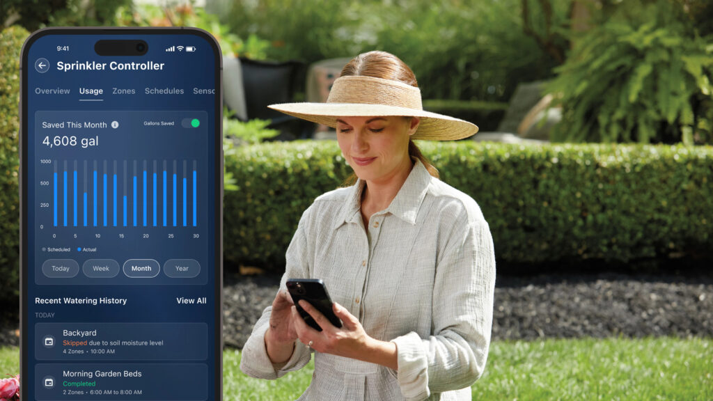 Replacing a clock-based controller with a Smart Sprinkler Controller can help reduce an average home’s outdoor water use by up to 30%, saving up to 15,000 gallons of water annually. Monitor your water usage and estimated savings in the app to help achieve your conservation goals