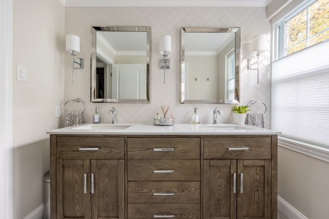 A quartz countertop on a wood vanity joins polished nickel finishes and creamy backsplash tile in a herringbone pattern to create an elegant look in this Philadelphia bathroom by Spring Creek Design.