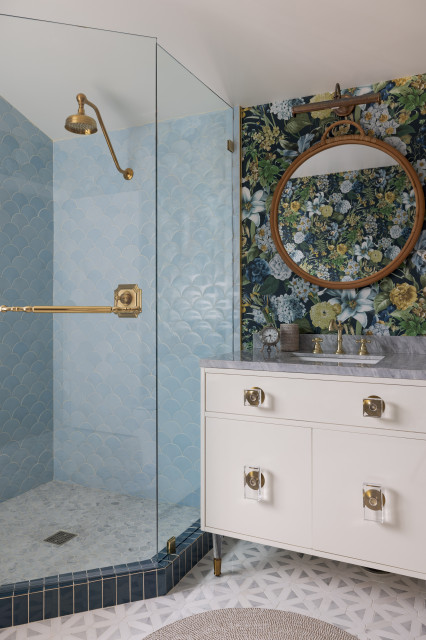 A floating vanity allows more of the beautiful Spanish tile flooring to show in this Phoenix bathroom by Cdot Design Studio.
