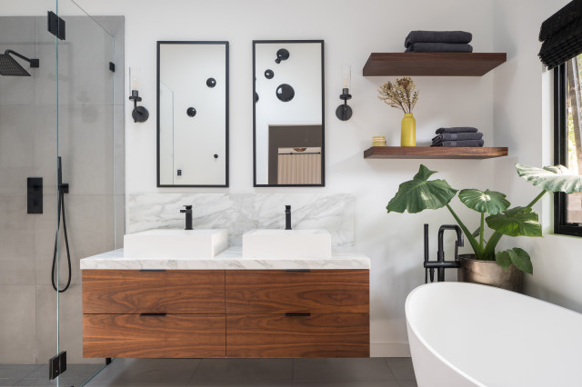 This Los Gatos, California, bathroom by Symmetry Designs features a substantial double vanity with generous counter space that offers opportunity for stylish decor.