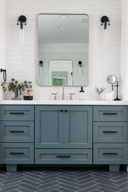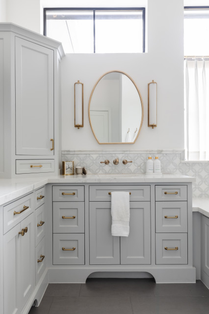 But many pros recommend skipping all that for a full-size drawer below a cabinet, as shown on this stylish vanity in an Orange County, California, bathroom by designer Madison Bettis of Madison Taylor. “They function well for storage, and it’s usable space instead of a faux drawer at the top that you can’t use because of the sink,” Bettis says.