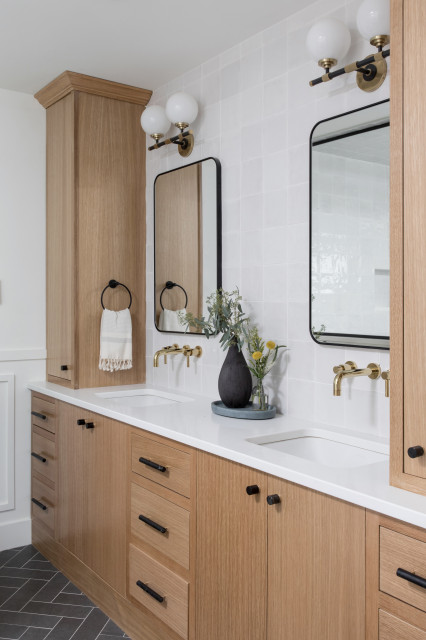 In this New York bathroom by Danielle Rose Design, two storage towers on a custom white oak vanity give eye-level access to bath essentials. And notice the wall-mounted faucets that free up countertop space and the mix of shallow and deep drawers.