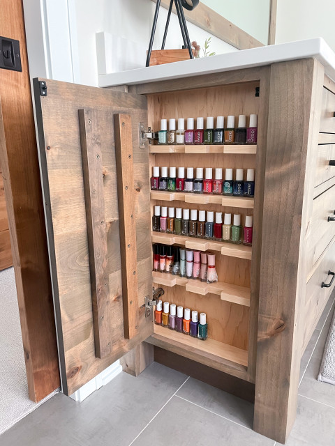 Trim Tech Designs came up with a creative solution to store nail polishes in a shallow cabinet on the side of a custom vanity in this Chicago bathroom.