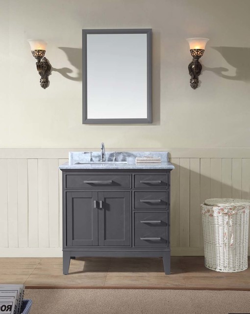 If you’re going with a single-sink vanity, consider customizing or looking for a prefabricated unit with a sink that sits off-center. This setup will get you a slightly larger counter surface on one side rather than two smaller areas flanking a centered sink. It also frees up room for a cabinet below the sink and a full bank of drawers on the other side, as with the 36-inch marble topped-vanity shown here.