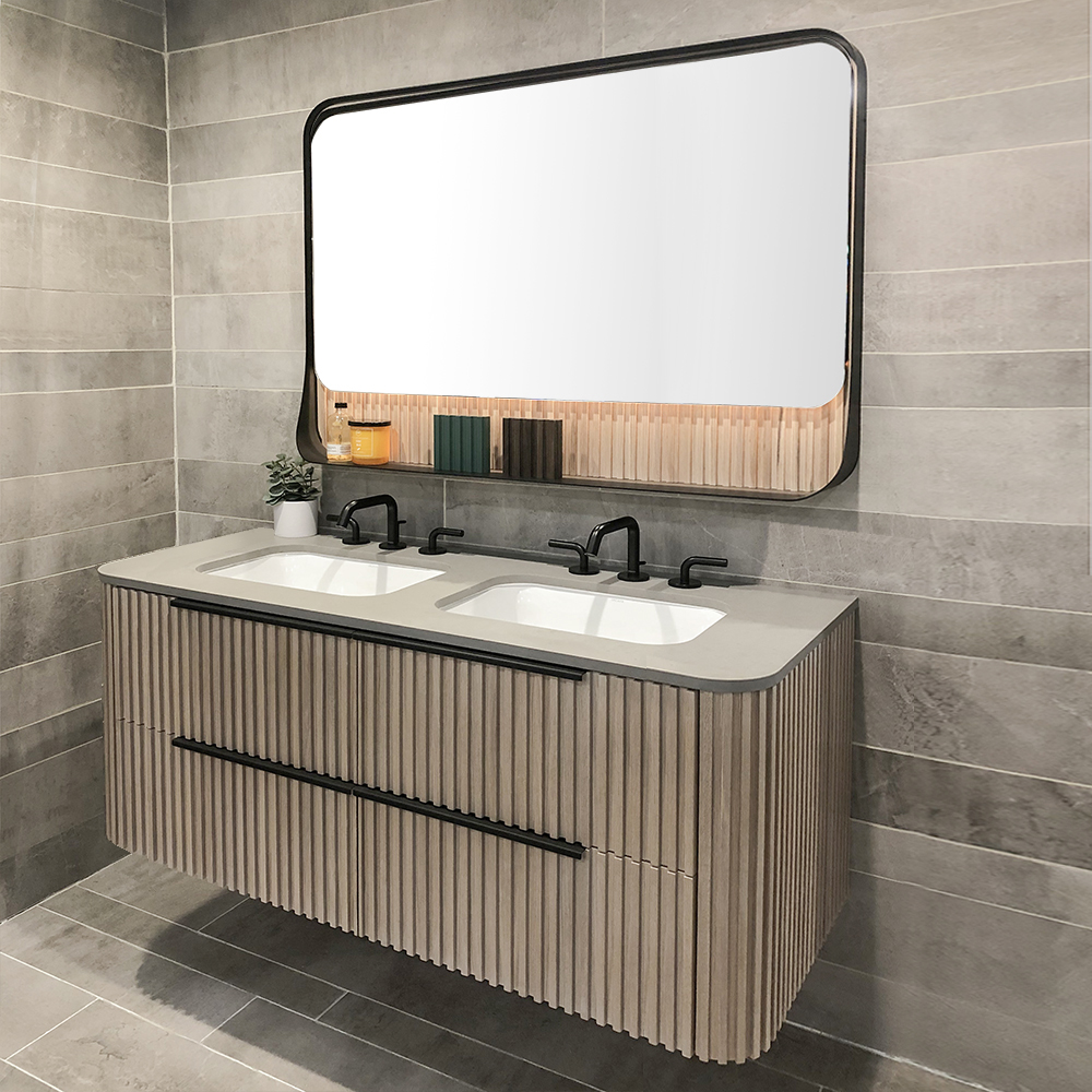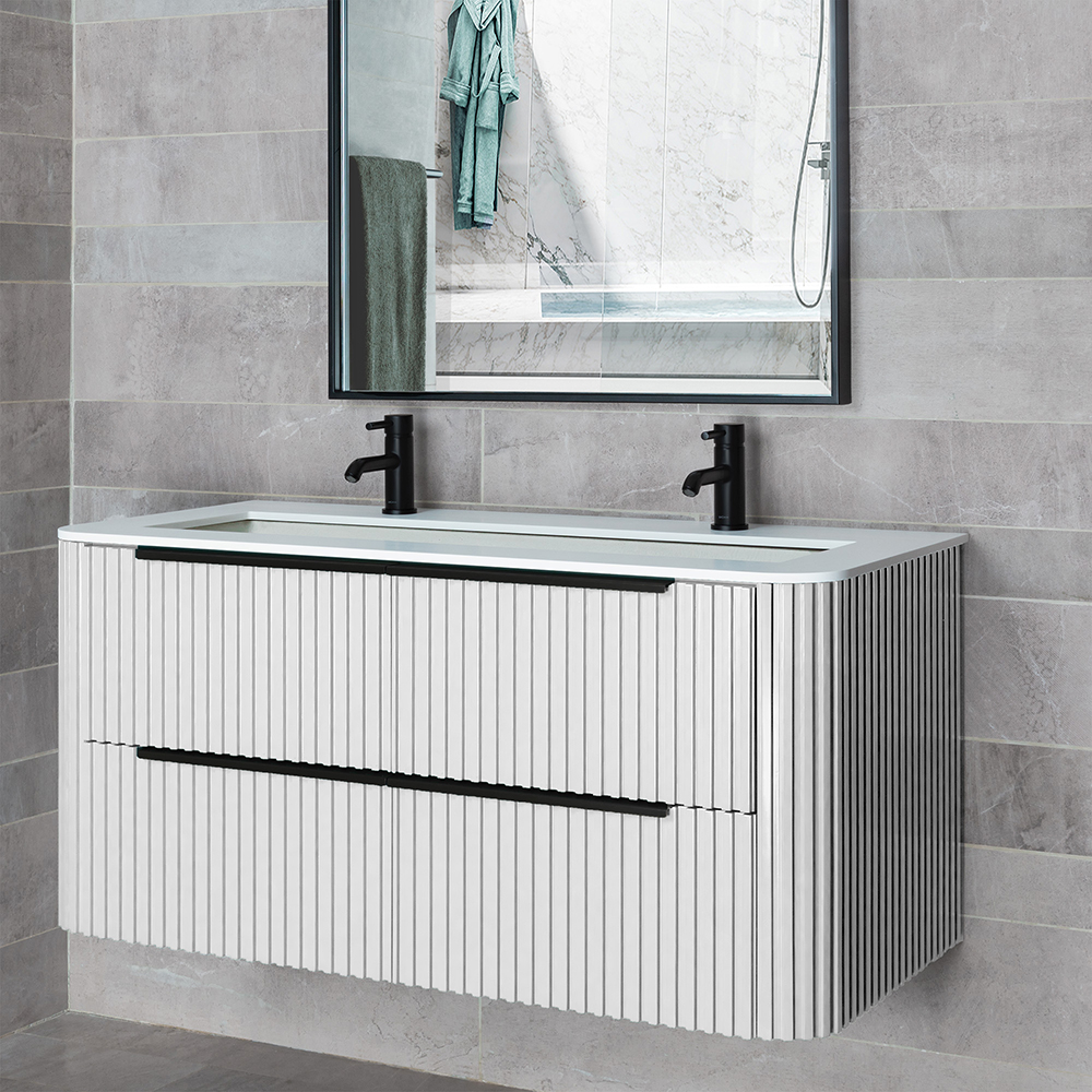 Wall mount vanities with under counter sink and fluted design are a stylish and practical addition to any bathroom. They are available in sizes 24, 30, 36, 48, 60 and 72 inches, providing a range of options to fit different spaces. These vanities are mounted on the wall, allowing them to save floor space and create a more open and airy feel in the bathroom. The under counter sink design allows for a seamless and clean look, while the fluted design adds a touch of elegance and sophistication. These wall mount vanities are a great choice for those looking to add a modern and functional piece to their bathroom.