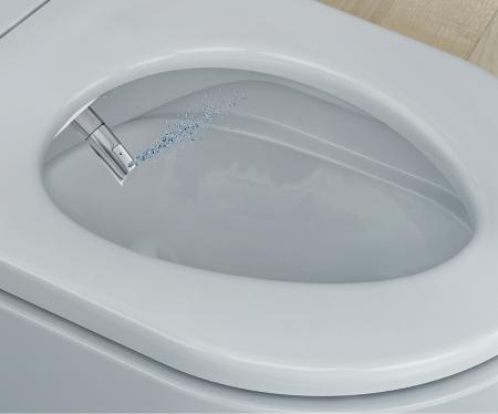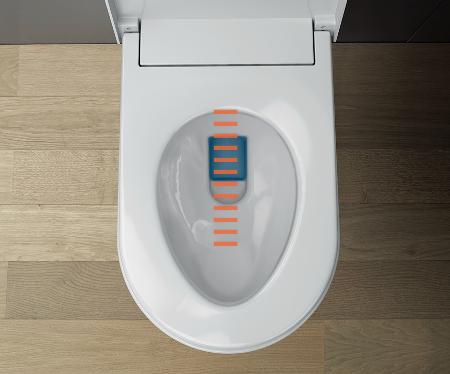 Improved rimless technology with rotating flushing stream in the inner bowl. By using an electronically controlled pump, the highly efficient flushing of the inner bowl occurs thanks to a lateral water outlet on the upper bowl rim.