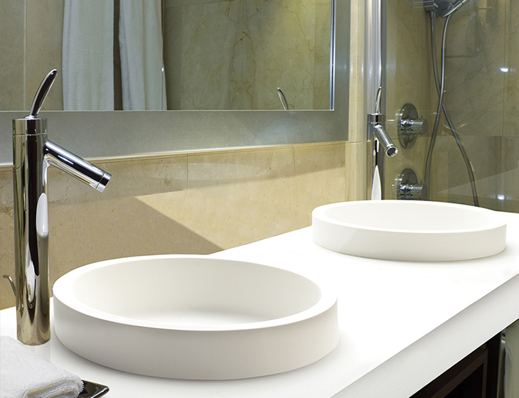 Halo 1 Semi-Recessed is a round bathroom sink, which allows only the top 1.5″ of the sink to rest on the vanity.