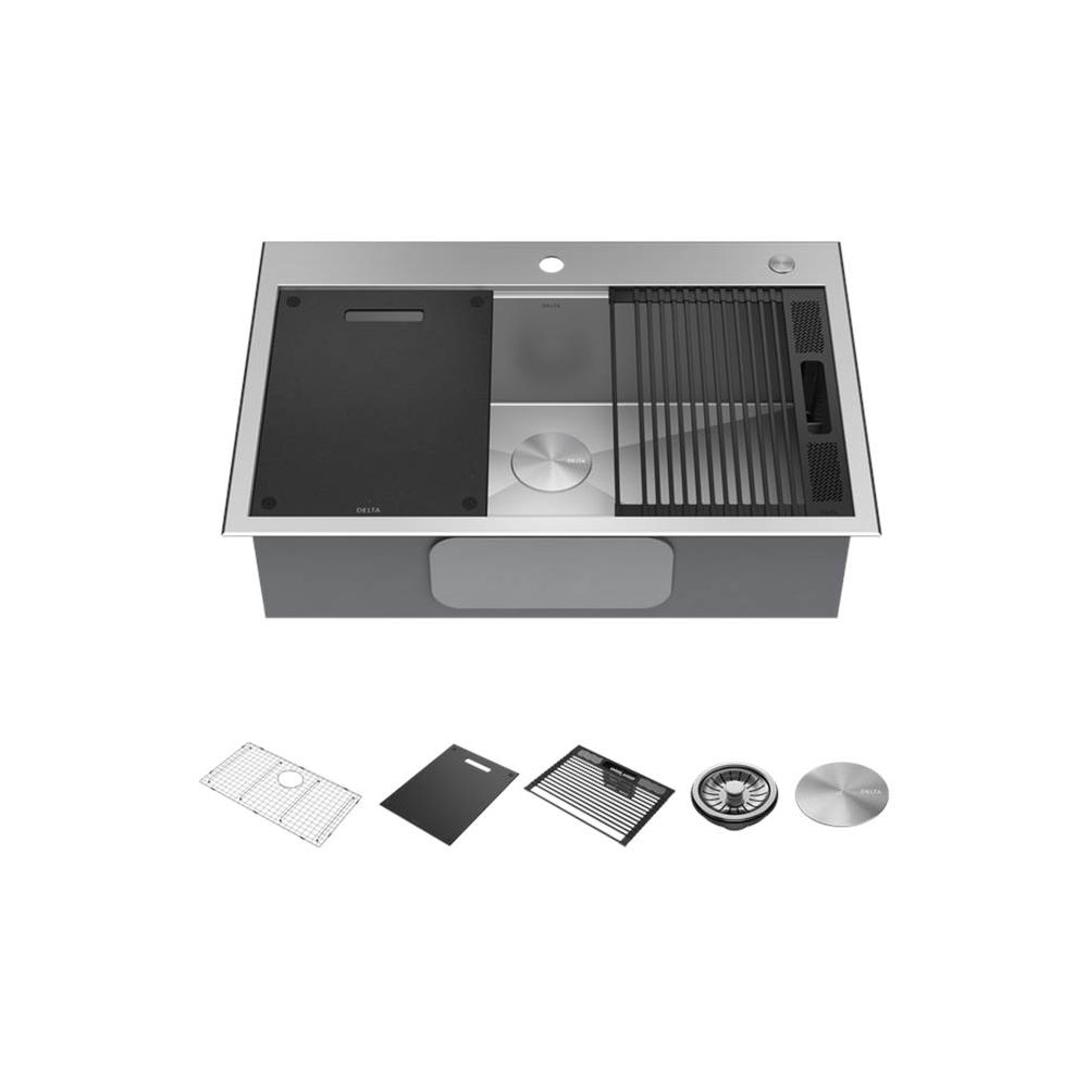 Introducing the 95A931-33S-SS DELTA Rivet™ 33” Workstation Kitchen Sink, a versatile and practical solution for your kitchen needs. Crafted by Delta, this sink redefines functionality with its drop-in top mount design and single bowl configuration, making it an ideal choice for small kitchens or bar areas. Constructed from durable 16 gauge stainless steel, the DELTA… Continue reading 95A931-33S-SS DELTA Rivet™ 33″ Workstation Kitchen Sink Drop-In Top Mount 16 Gauge Stainless Steel Single Bowl with WorkFlow™ Ledge and Accessories