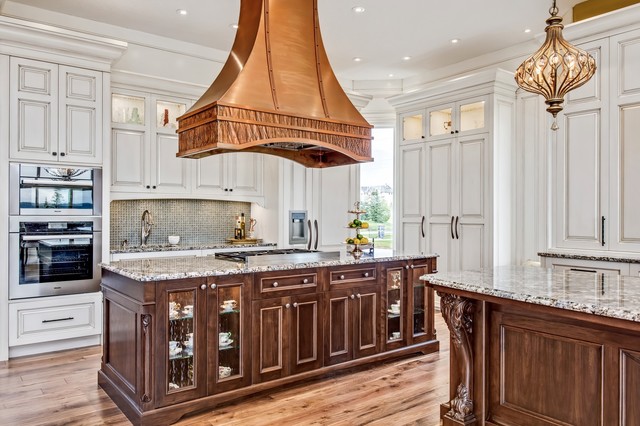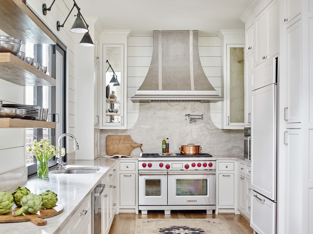 In a traditional kitchen, a mantel-style range hood works well, as does a decorative wood hood, Gilmer says. “In traditional, a lot of people like to have hoods made out of wood and painted whatever color the kitchen is,” she says.