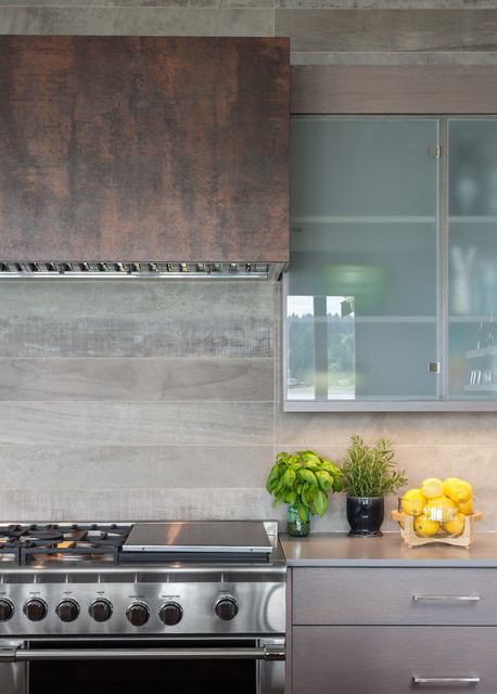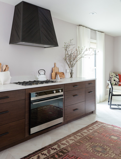 A variegated metal finish for this clean-lined hood in a contemporary-style kitchen brings warmth to the kitchen. “You can get really creative when it comes to contemporary style,” says Hellen Hsieh of Design Loft Co.