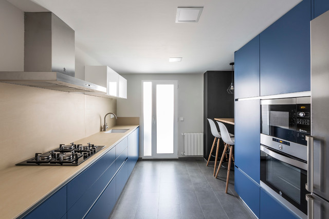 For a contemporary kitchen, you’ll probably want to consider a range hood that has clean lines — meaning a minimum of embellishment. The stainless steel hood in this blue kitchen is a good example of a clean-lined style. This type of hood is called chimney-style.